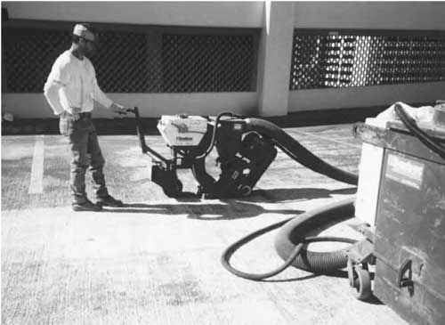 Substrate adhesion and proper substrate finishing are critical for successful deck-coating applications. In general substrates must be clean, dry, and free of contaminants. Concrete substrates exhibiting oil or grease contamination should be cleaned with a biodegradable degreaser such as trisodium phosphate. Contaminants such as parking-stall stripe paint should be removed by mechanical grinder or sandblasting (Figs. 3.22 and 3.23).